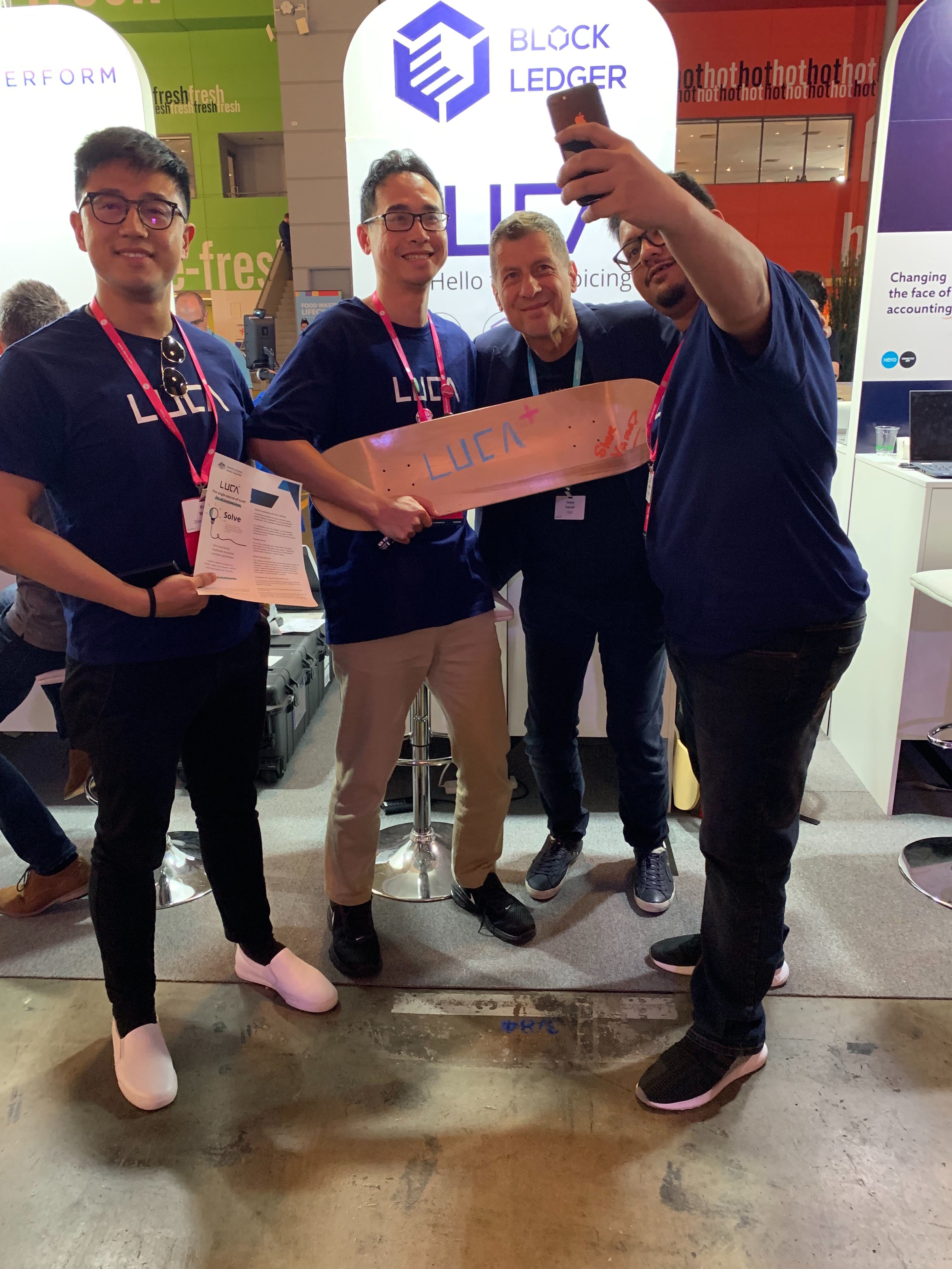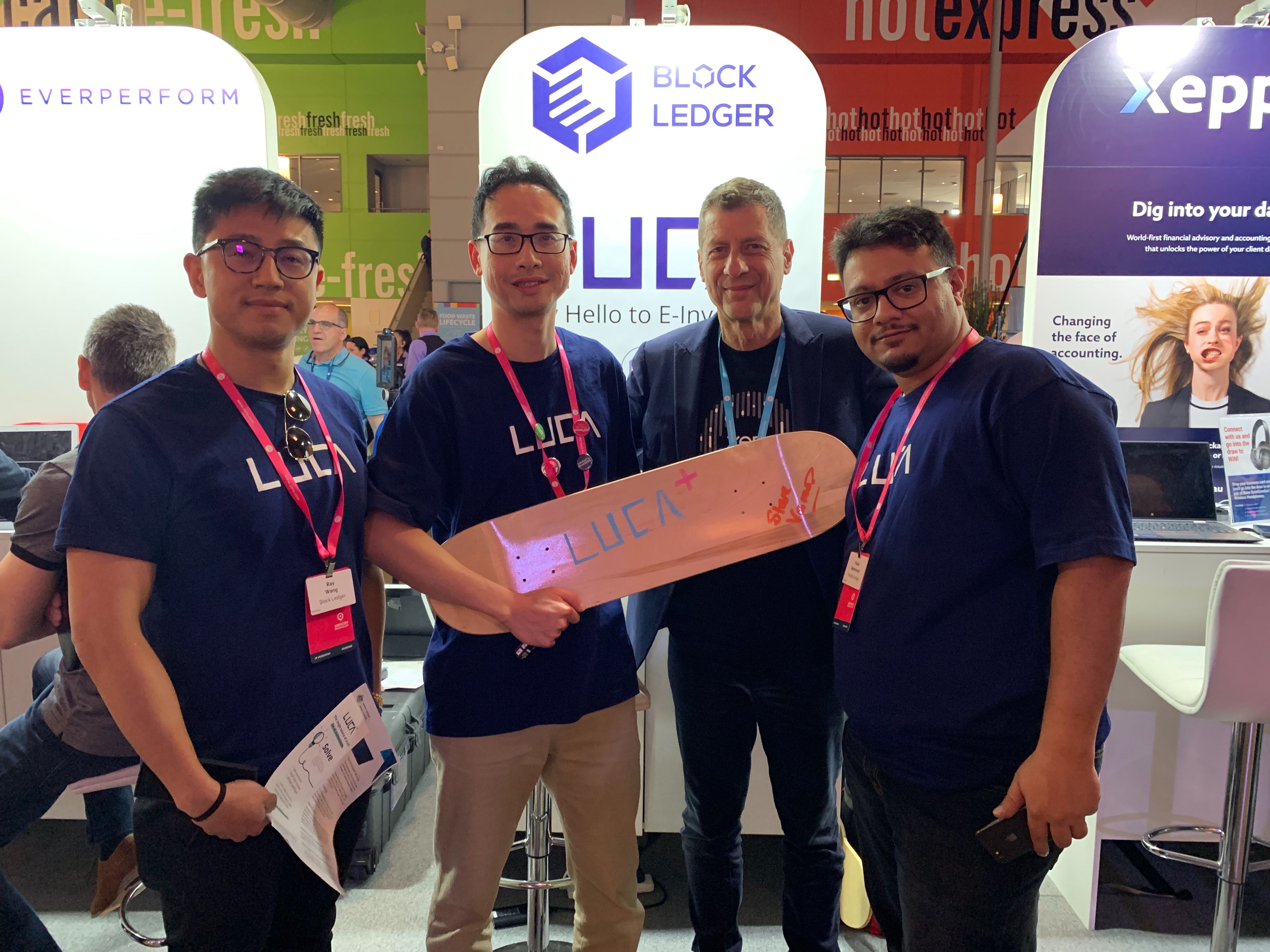 Founders DAXIN INP Group Leo Huang and Block Ledger leaders celebrate the success of LUCA development.